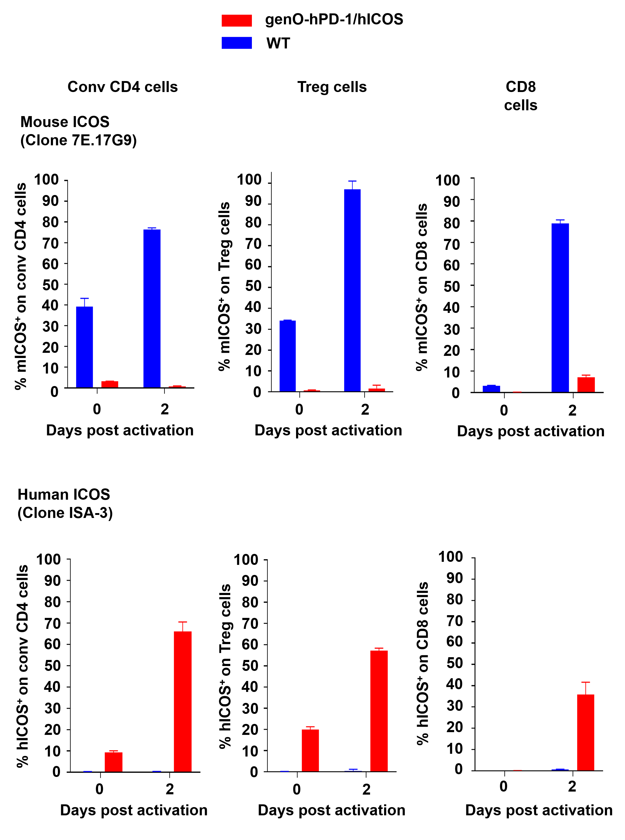 - Physiological expression of human PD-1 and human ICOS